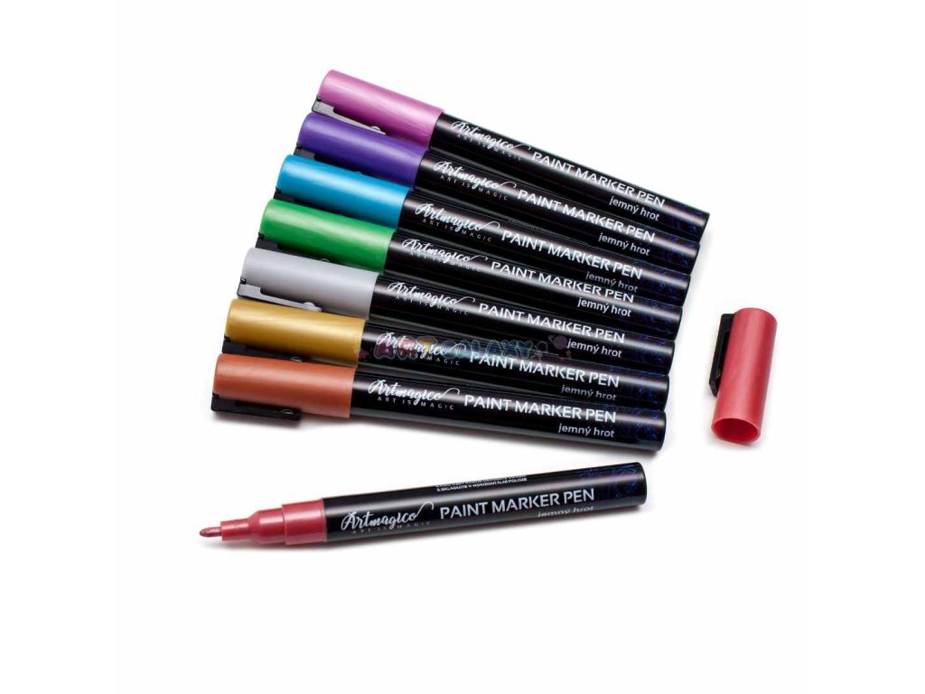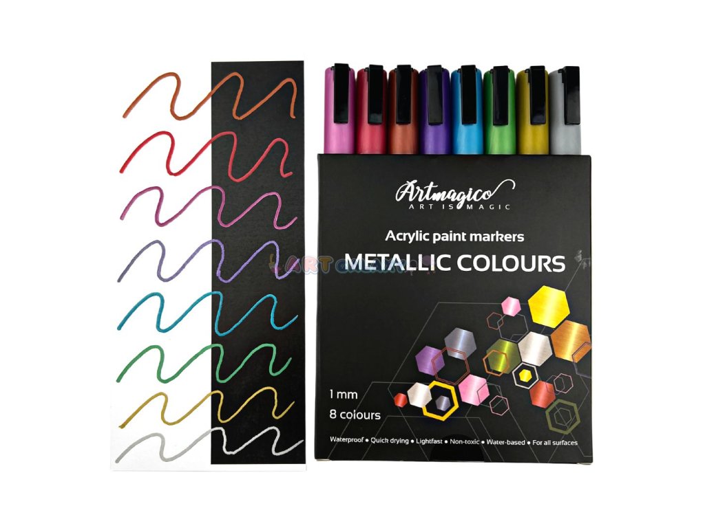Sada akrylových popisovačů zn. Artmagico řady SMART v 8 metalických barvách s tenkým vyměnitelným hrotem (0,9 - 1,3 mm). Fixy použijete na všechny povrchy a jejich krytí Vás překvapí zejména na tmavém povrchu. Univerzální velikost hrotu, která je vhodná k vybarvování a potěší i přesnou linií.