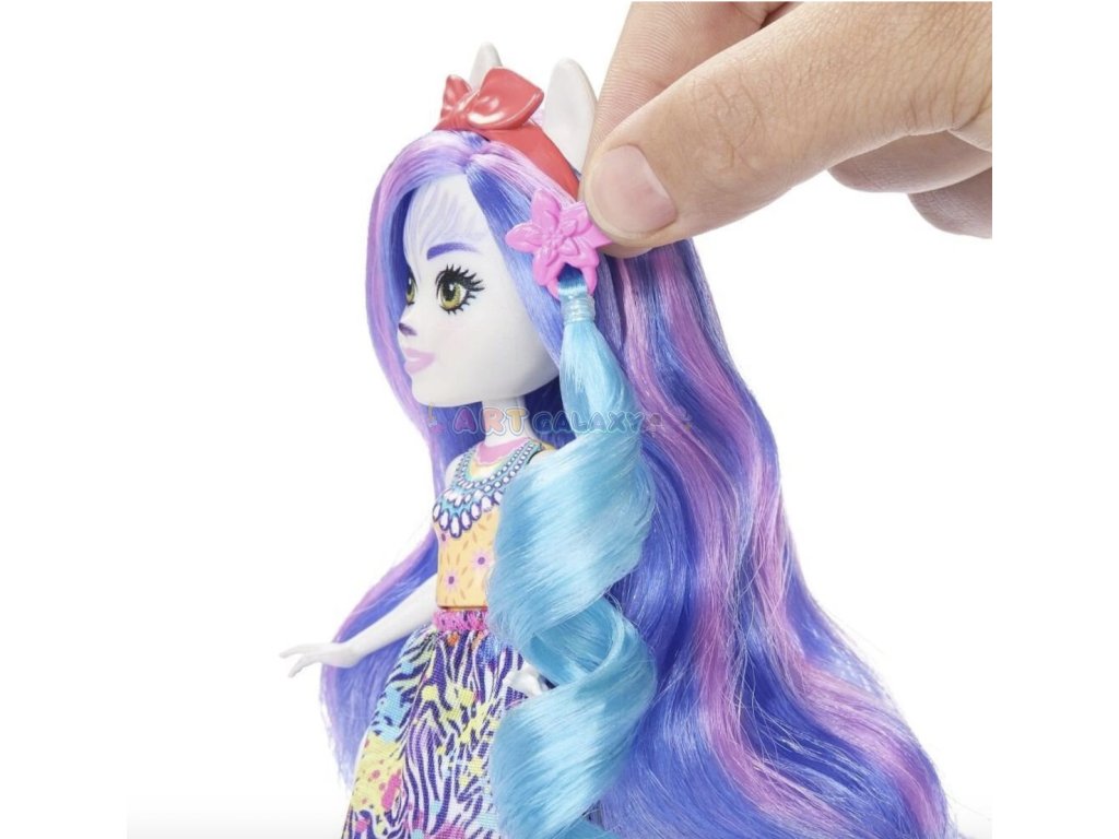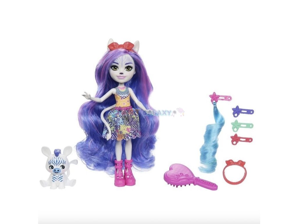 Panenka Zemirah Zebra z řady Enchantimals, s dlouhými vlasy, stylovými příslušenstvími a zvířecím parťákem Grainy.