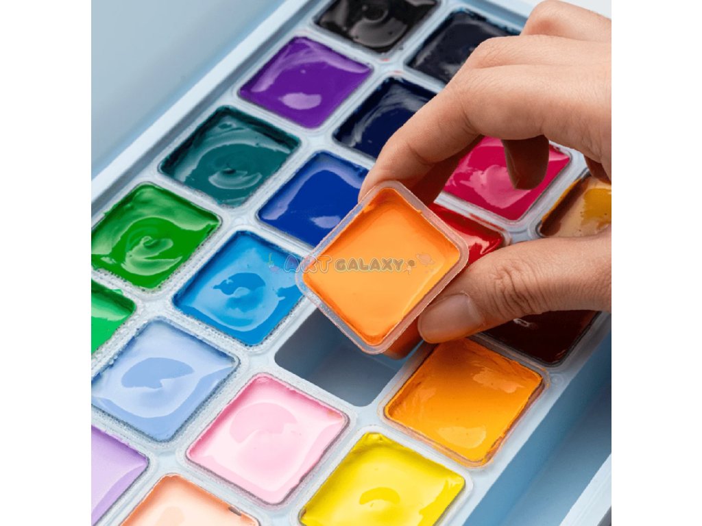Tato sada 24 krásně sladěných barev v moderním modrém kufříku zaujme nejen vzhledem, ale i kvalitou. Pigmenty jsou intenzivní a dobře kryjí už v první vrstvě. Textura je hustá, ale hladká – ideální pro techniky vrstvení, přechodů i detailní práci.
