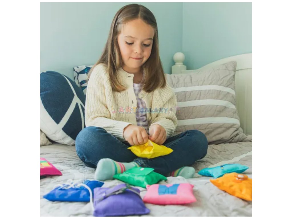 Sada měkkých pytlíčků, která učí děti základním dovednostem při oblékání a rozvíjí jemnou motoriku. Hravý způsob, jak se naučit zapínat knoflíky, zipy a další zapínání.