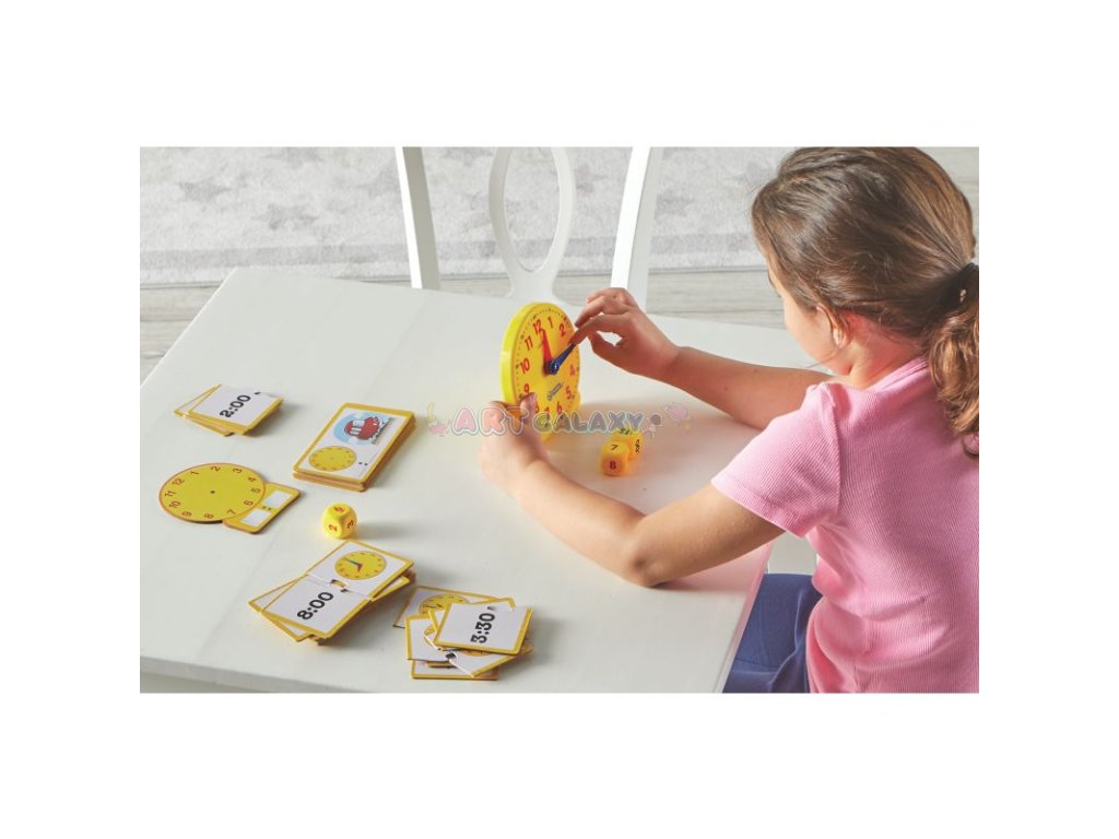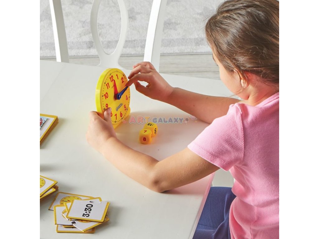 Time Activity Set od Learning Resources je kompletní pomůcka, která dětem pomáhá pochopit, jak fungují hodiny, co znamenají ručičky a jak vypadá průběh dne od rána až po večer.