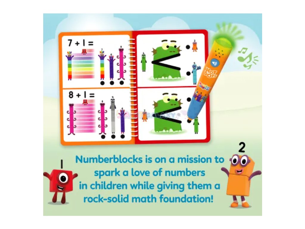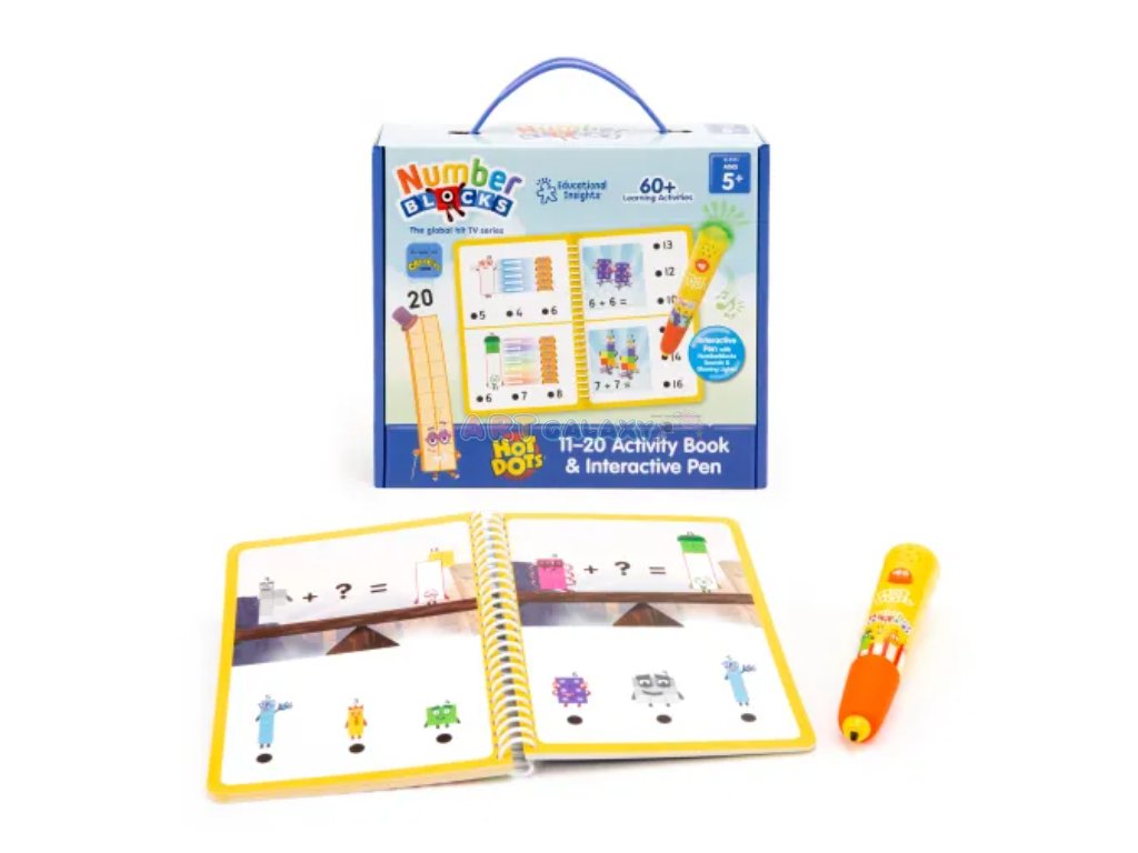 Sešit aktivit vychází z oblíbeného seriálu Numberblocks a obsahuje více než 75 úloh, které dětem pomáhají procvičovat rozpoznávání čísel, pořadí, sčítání, odčítání i základní násobení a dělení. Interaktivní pero při dotyku na správnou odpověď zasvítí zeleně, při chybě červeně, a díky zvukovým efektům dodává učení ještě větší zábavu. Robustní konstrukce s pogumovaným úchopem je přizpůsobená malým dětským ručkám.