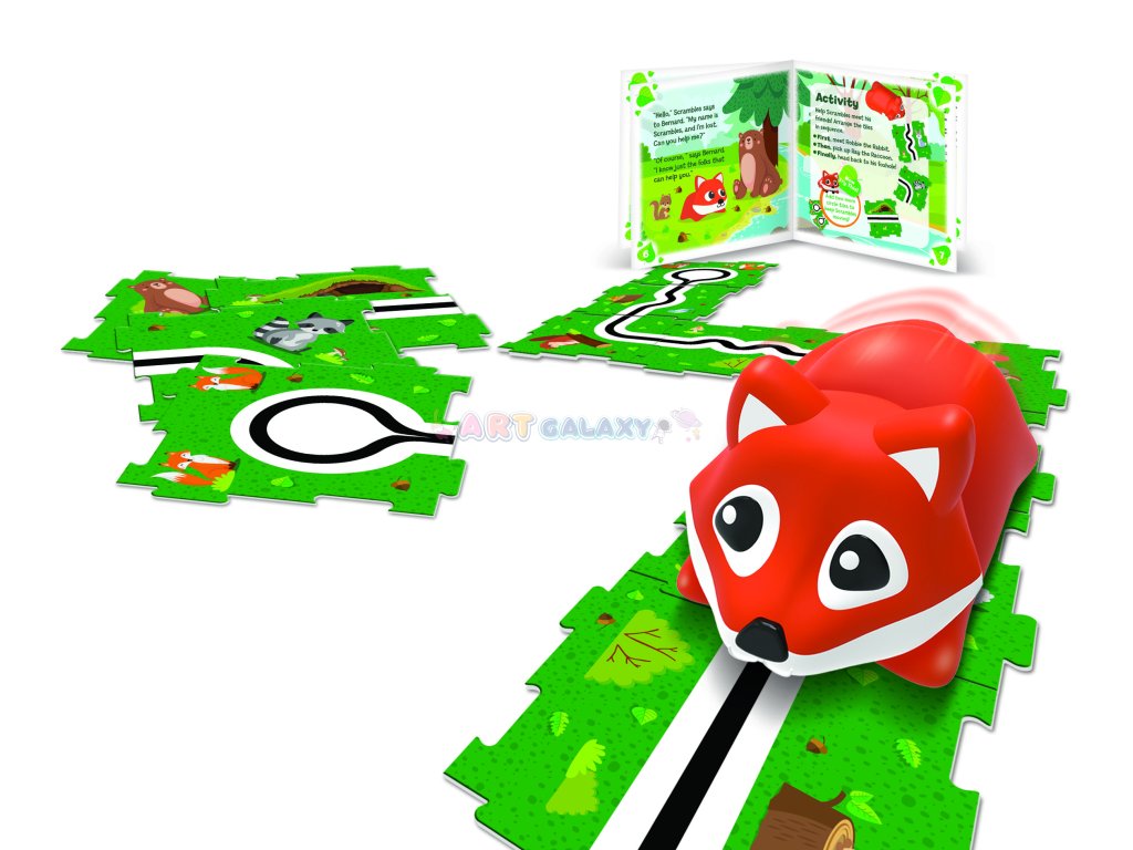 - Obsah balení: Programovací liška Scrambles, dvě oboustranné karty s aktivitami a jednoduchým návodem.