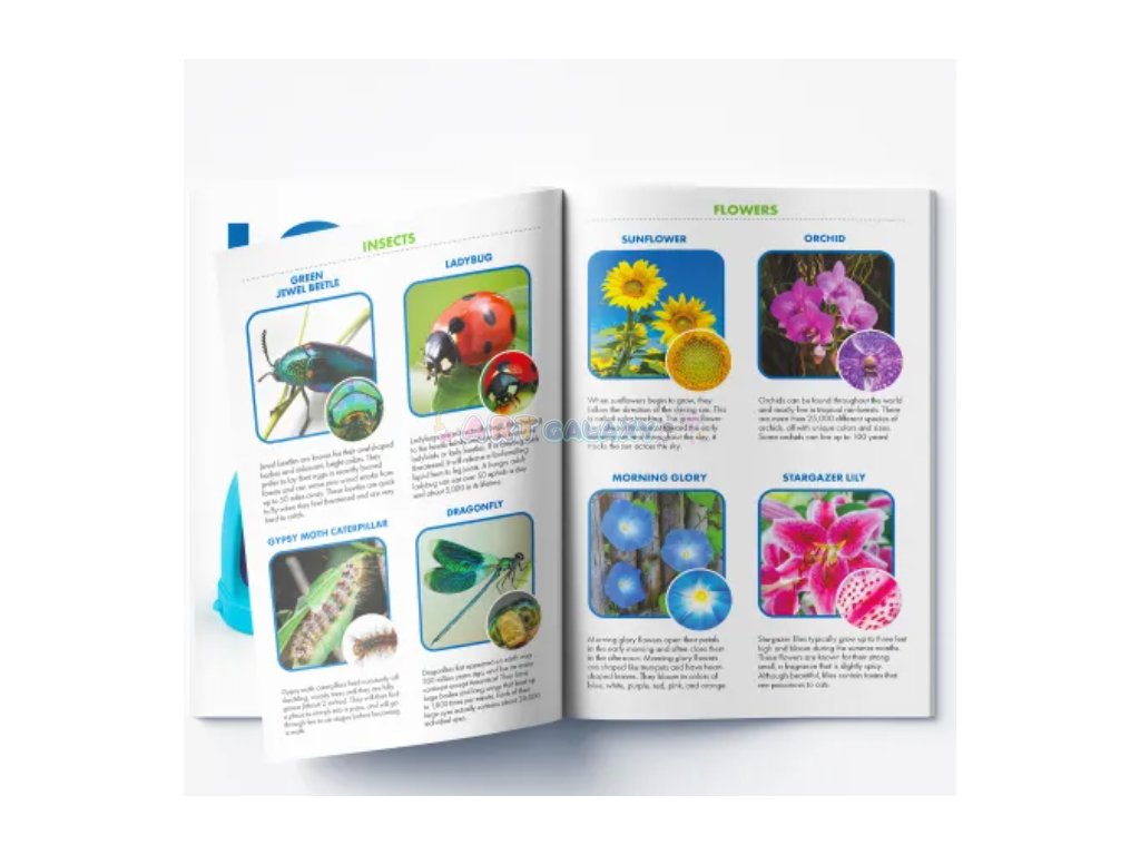 Mikroskop KidScope umožňuje dětem pozorovat svět zblízka pohodlně a přirozeně. Dvojitý průzor znamená, že děti nemusí zavírat jedno oko, a díky LED osvětlení je obraz vždy jasný. Otočný stolek a velký zaostřovací knoflík usnadňují manipulaci. Součástí je 15 diapozitivů se 60 barevnými obrázky přírody a vědy, které zaručují okamžitý úspěch při pozorování. Praktický průvodce přináší více než 180 faktů, takže se učení mění v zábavné objevování.
