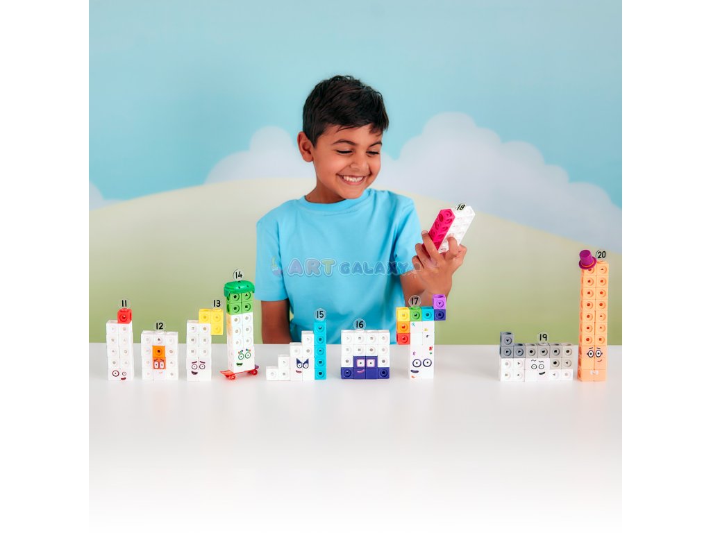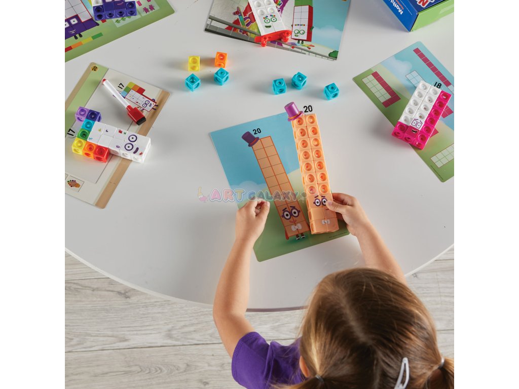 Navazující edice MathLink® Cubes Numberblocks 11–20 přenáší děti do světa vyšších čísel s oblíbenými postavami jako Čtrnáctka se skateboardem nebo Dvacítka s cylindrem. Díky barevným kartám s postavami si děti vytvoří vizuální a emocionální vztah k číslům a snadněji pochopí jejich význam.