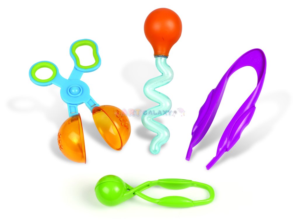 Pinzety a nástroje v sadě jsou vyrobeny z odolného plastu a uzpůsobeny tak, aby se pohodlně vešly do malých dětských rukou. Každý nástroj cílí na specifické dovednosti, které jsou základem pro psaní, kreslení i sebeobsluhu.
