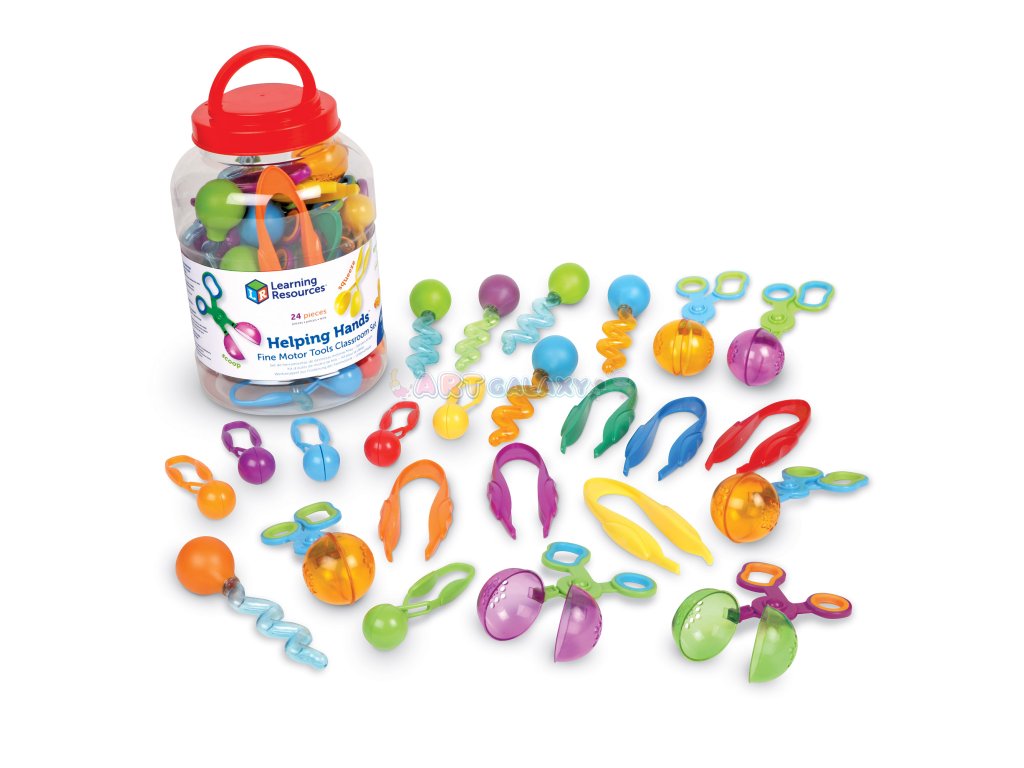 Tato učitelská sada nástrojů Helping Hands™ byla navržena s ohledem na potřeby skupinového vzdělávání. Obsahuje čtyři typy nástrojů, které podporují různé aspekty jemné motoriky – uchopování, mačkání, stříhání i kapání. Barevné provedení pomáhá při třídění a zvyšuje zaujetí dětí.