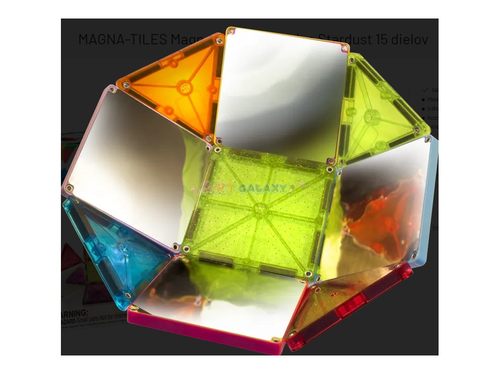 Magna-Tiles Stardust je menší, ale velmi působivá sada, která promění běžné stavění v magický zážitek. Dílky jsou průhledné, plné třpytek a některé mají zrcadlový efekt – děti tak mohou pozorovat světlo, odrazy a barvy úplně novým způsobem.