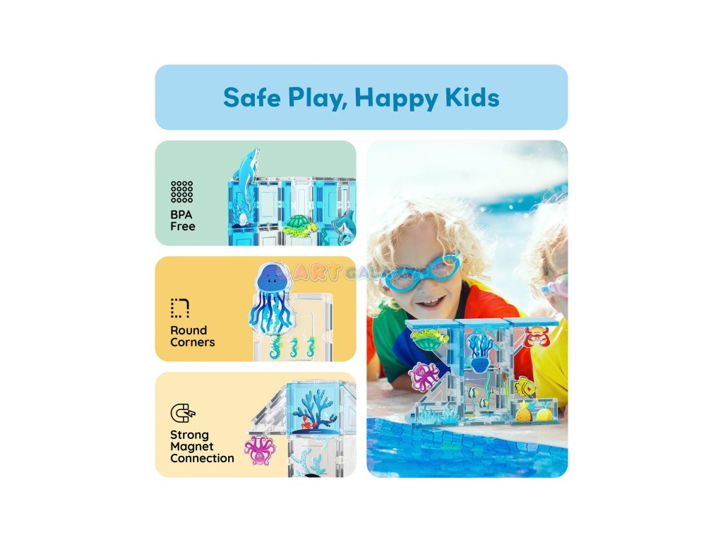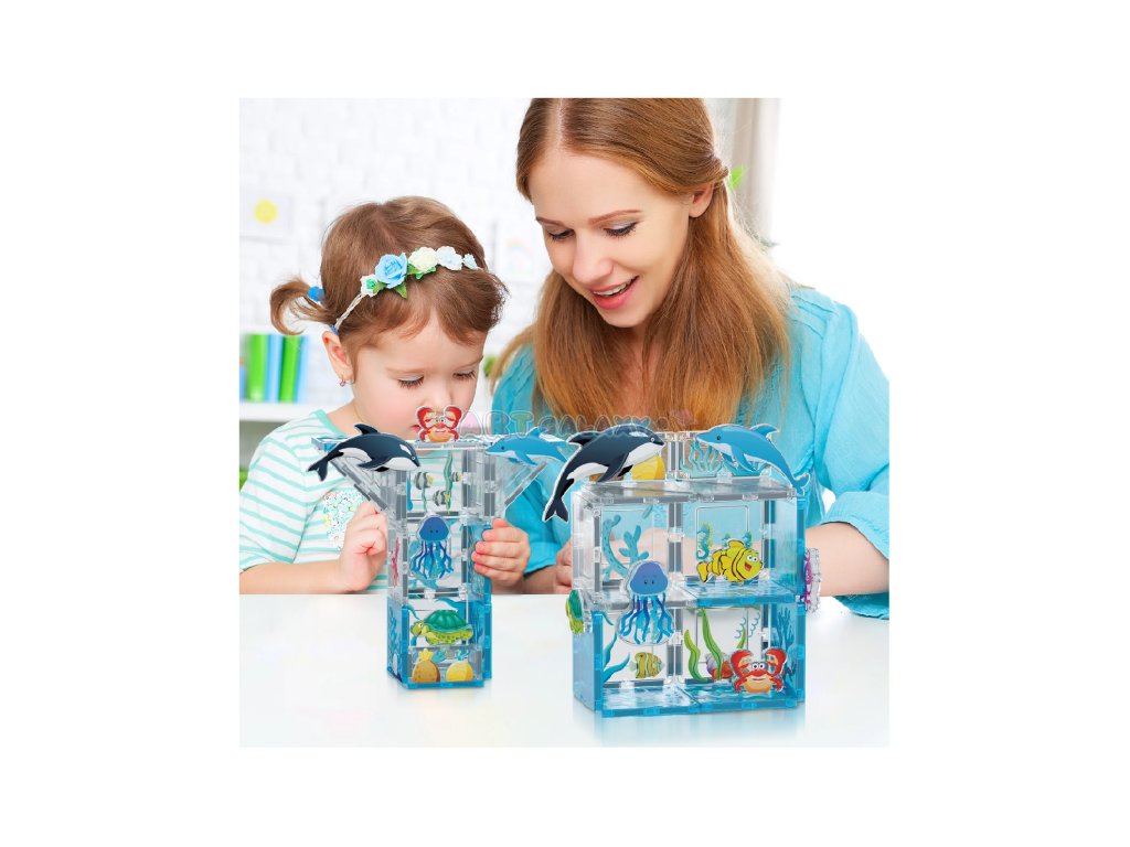 Sada Mořský svět přináší potištěné magnetické dílky a 8 figurek mořských živočichů, se kterými si děti mohou vytvořit vlastní akvárium nebo podmořskou scénu plnou fantazie.