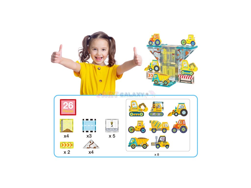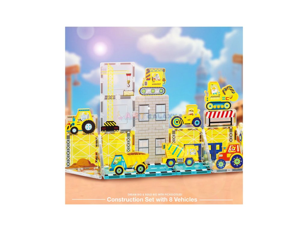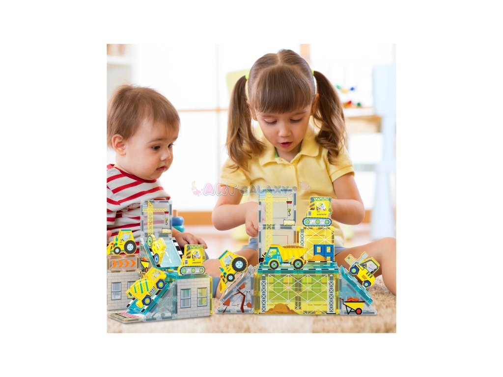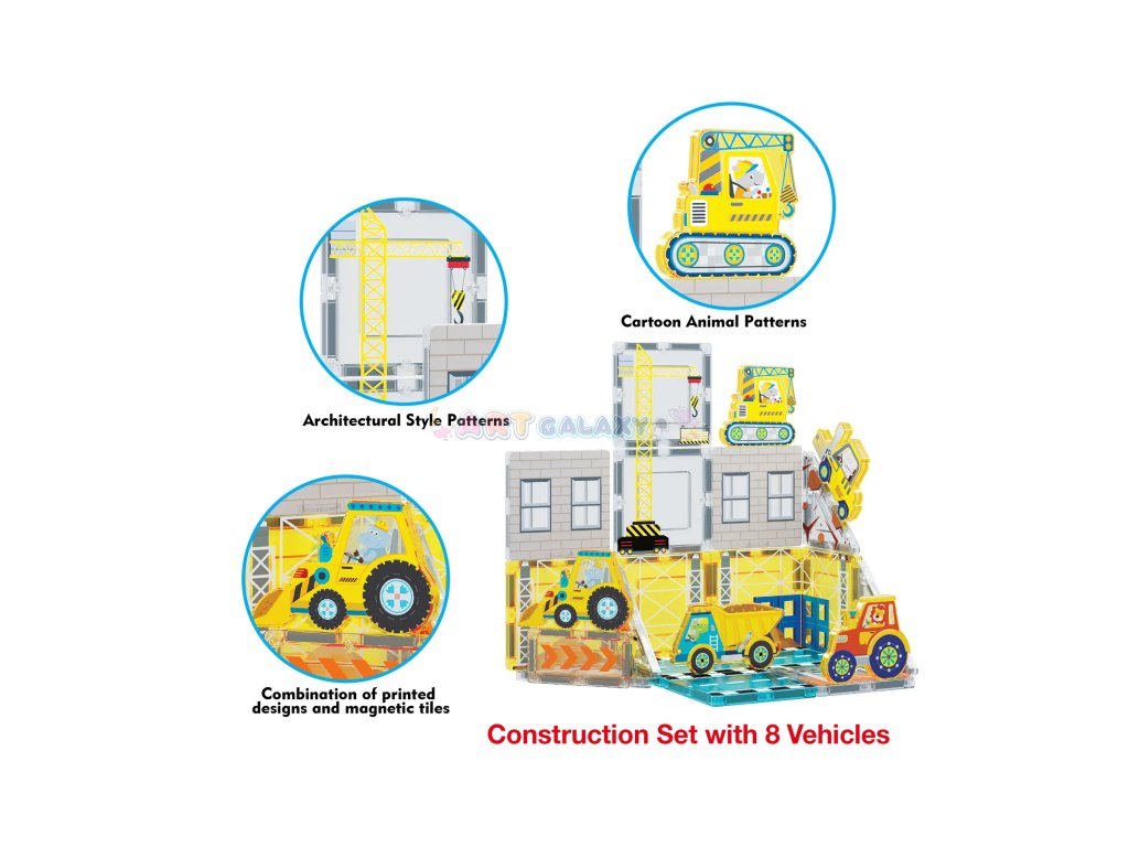 Sada Staveniště přináší magnetické dílky s realistickým potiskem a kolekci stavebních vozidel, díky kterým si děti mohou vytvořit vlastní rušné staveniště plné bagrů, jeřábů a dalších silných strojů.