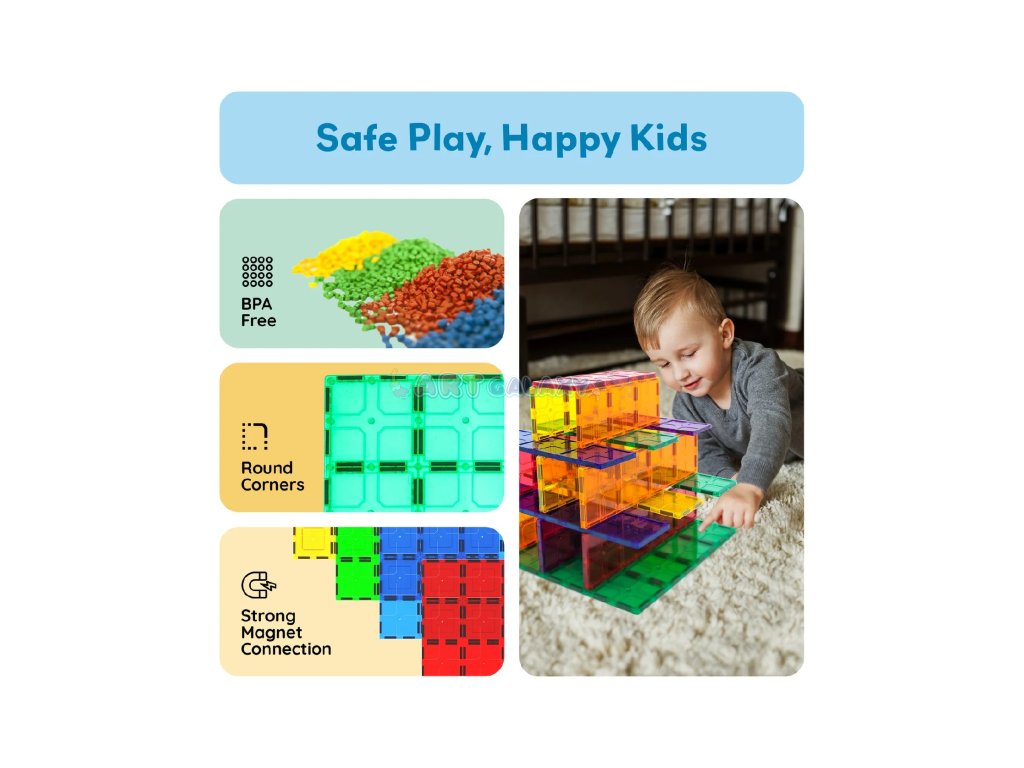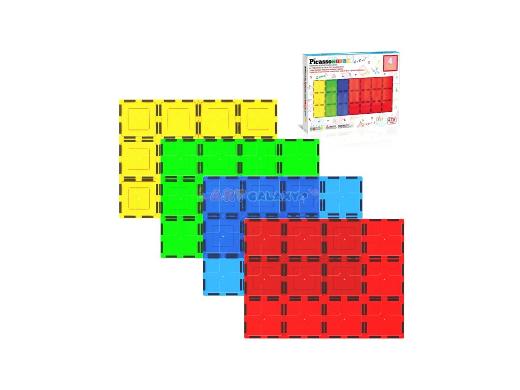 Pečlivě navržená sada čtyř obřích stabilizačních destiček poskytuje pevný a stabilní základ pro stavby z magnetických dlaždic. Každá destička o rozměru 30 × 22 cm (12" × 9") nabízí čtyřnásobek plochy běžné čtvercové dlaždice – celkem odpovídá 48 klasickým kostkám.
