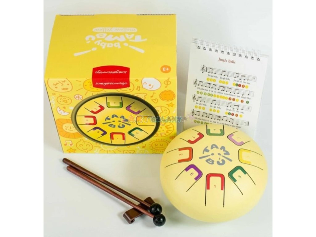 Tambú Baby je menší verze oblíbeného kovového bubínku TAMBÚ, která je ideální pro malé hudebníky. Barevně označené noty a jemný, relaxační zvuk z něj dělají perfektní nástroj pro první hudební krůčky.